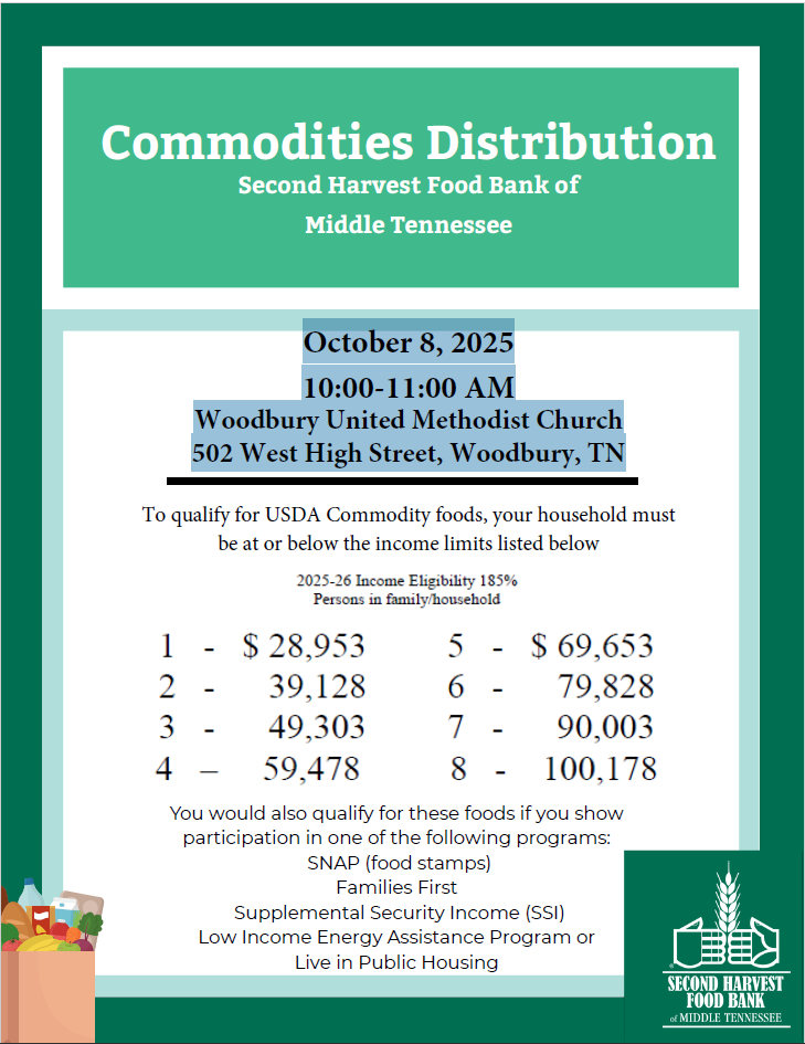 Commodities Distribution October 8, 202510:00-11:00 AMWoodbury United Methodist Church502 West High Street, Woodbury, TN
